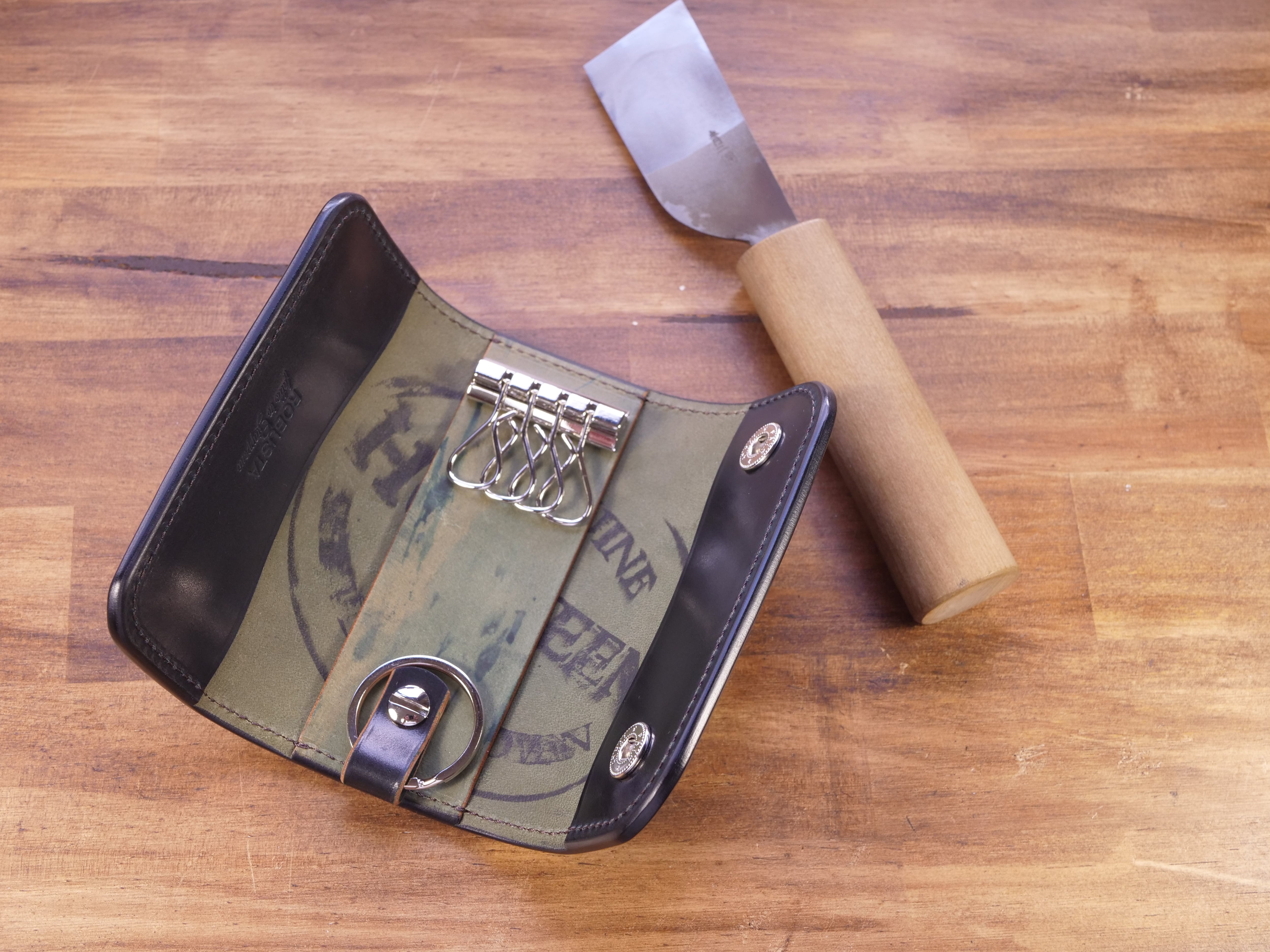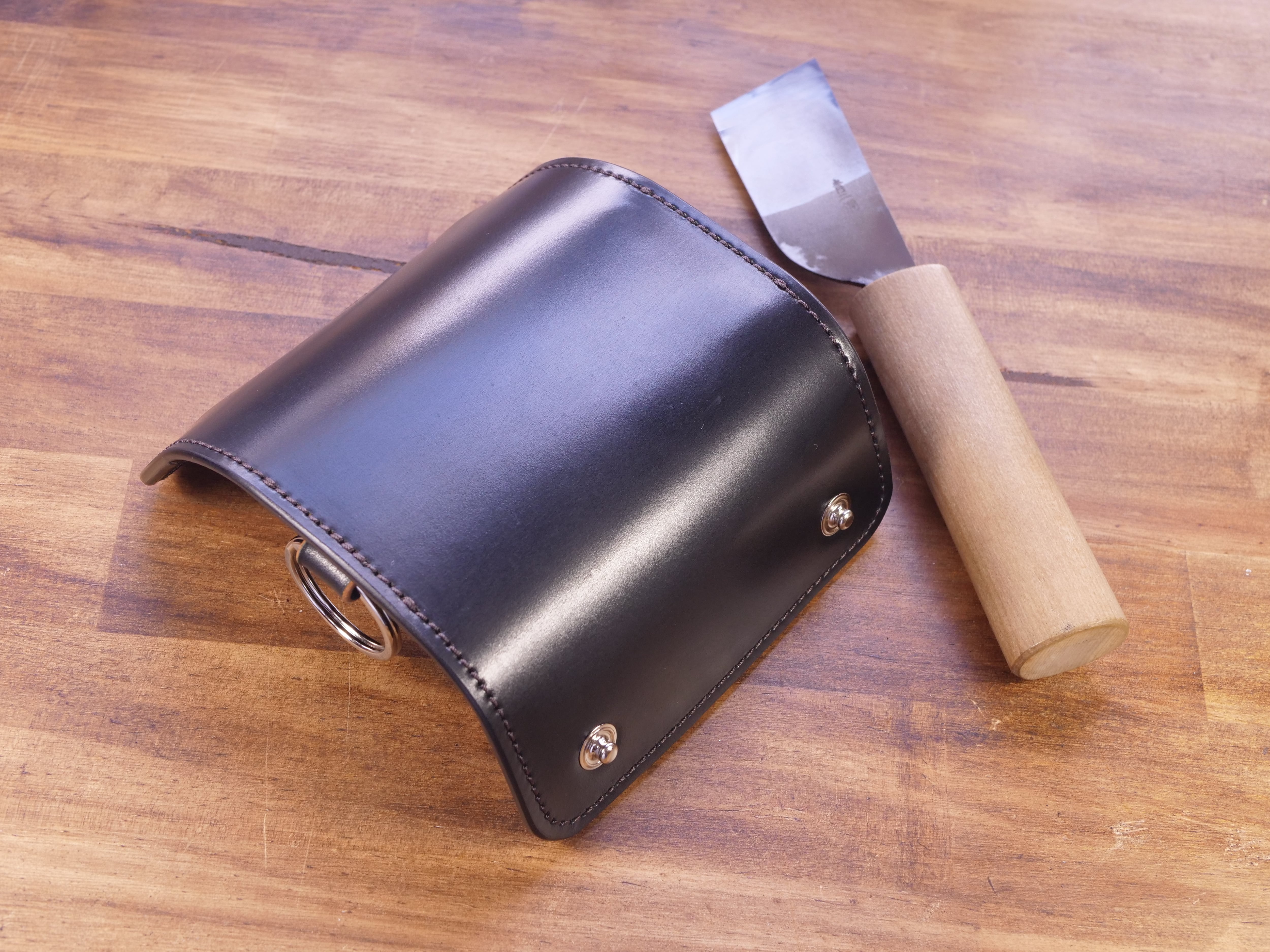 外装の革は1枚モノではなく、シェルコードバン裏面を貼り合わせ厚みを増しています。